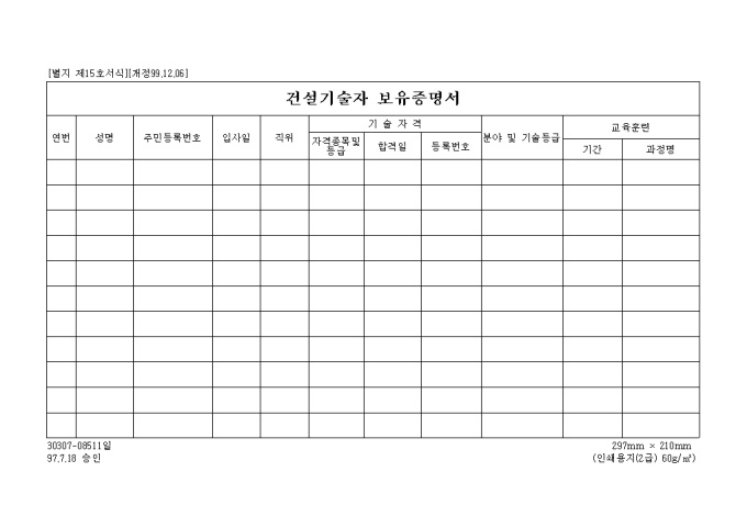 [별지 제15호서식] 연번, 성명, 주민등록번호, 기술자격, 분야 및 기술등급등으로 구성된 건설기술자보유증명서 양식입니다.