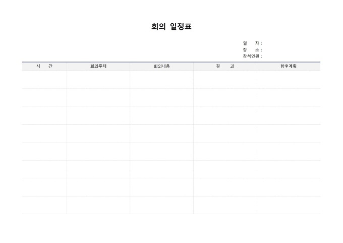 회의일정표입니다. 일자, 장소, 참석인원, 시간, 회의주제, 회의내용, 결과, 향후계획 등으로 구성되어 있습니다.