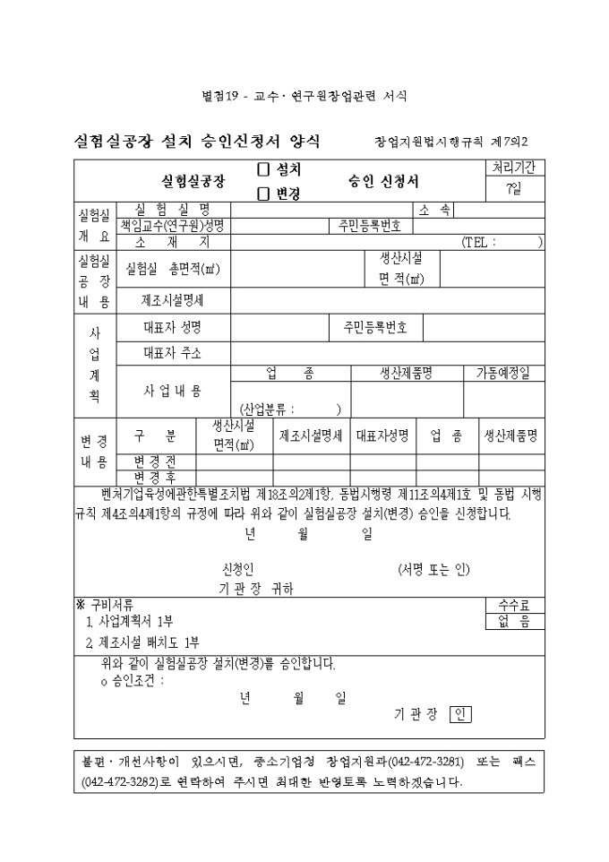 9,000원/월벤처기업육성에 관한 특별조치법 제18조의2제1항, 동법시행령 제11조의4제1호 및 동법 시행규칙 제4조의4제1항의 규정에 따른 실험실공장 설치(변경) 승인을 신청서 양식입니다.