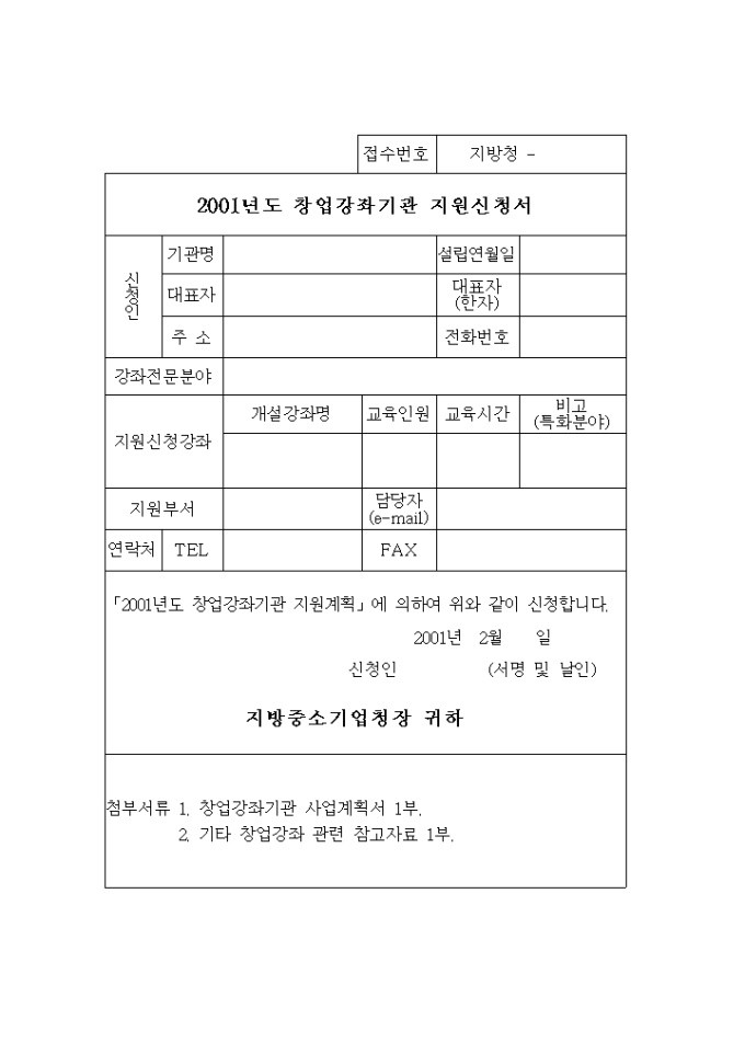 9,000원/월2001년도 창업강좌기관 지원계획에 의한 창업강좌기관 지원신청서 양식입니다. 추가로 창업강좌 사업계획서 양식이 청부되어 있습니다. 상세한 내용은 다음과 같습니다.