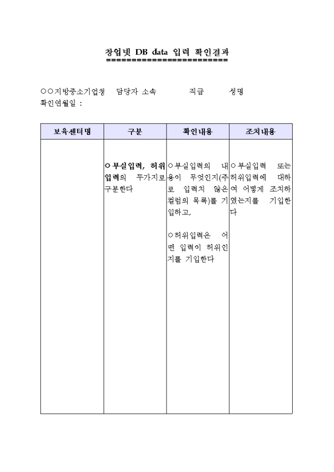 9,000원/월창업넷 DB data 입력 확인결과(지방청용)양식입니다.
