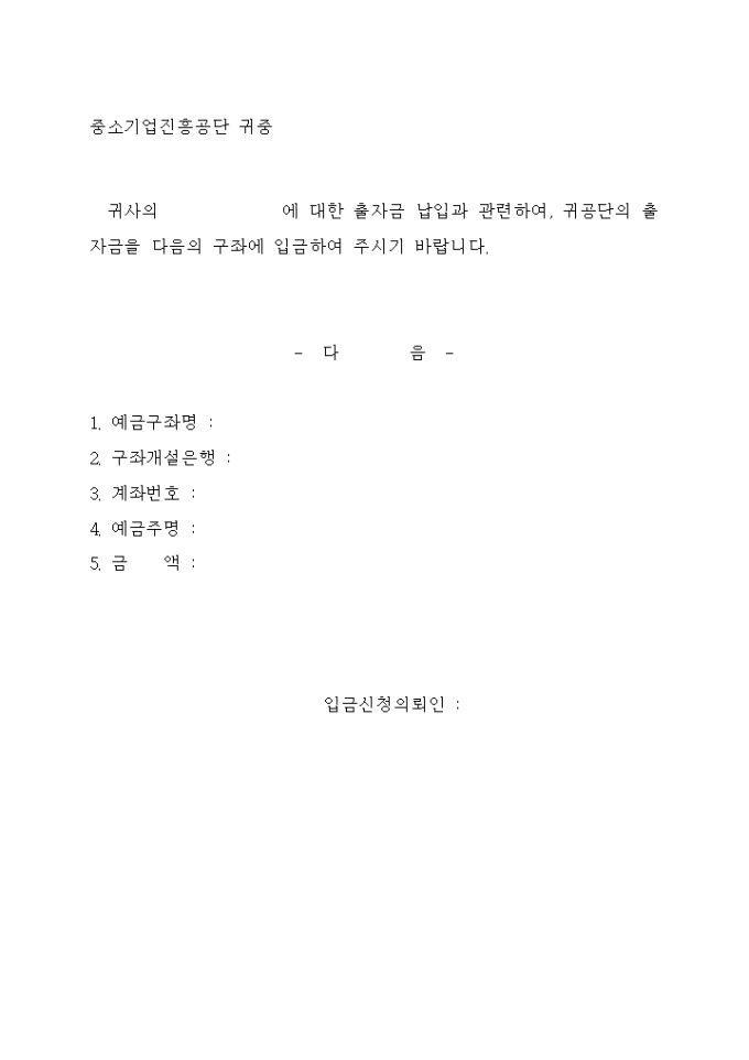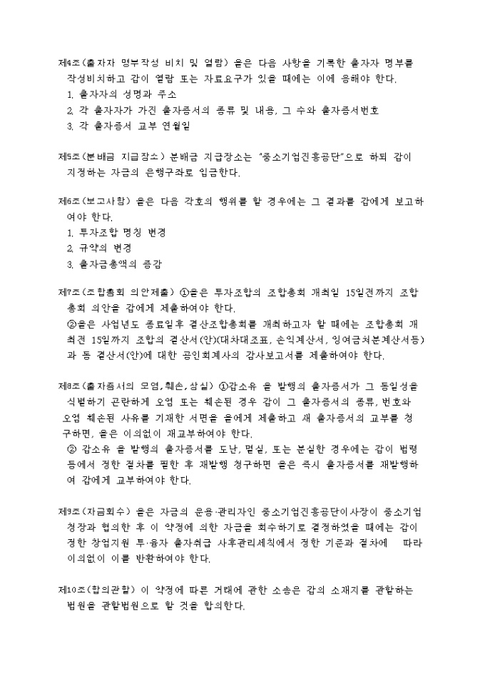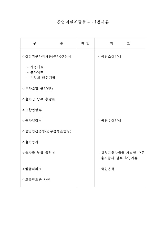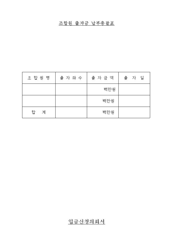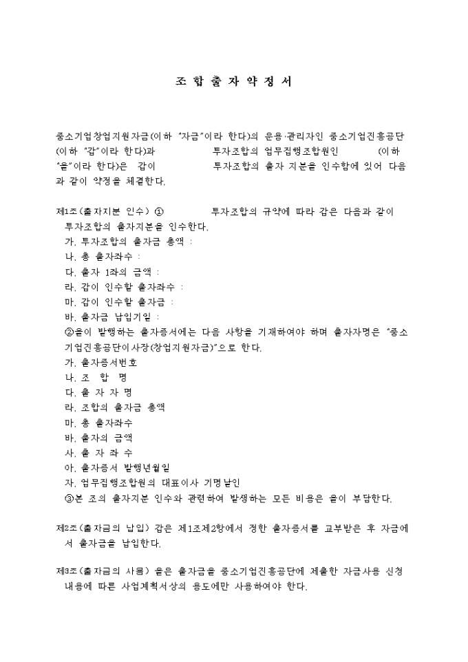 창업지원자금출자서류와 조합출자약정서, 창업지원자금 사용(출자) 신청서, 조합원 출자금 납부총괄표, 입금신청의뢰서등으로 구성되어 있습니다.