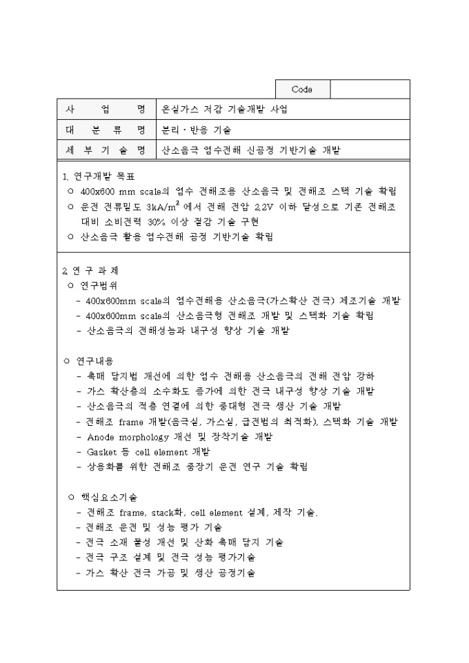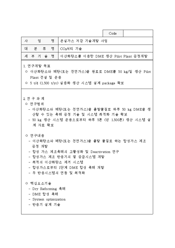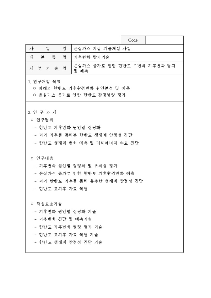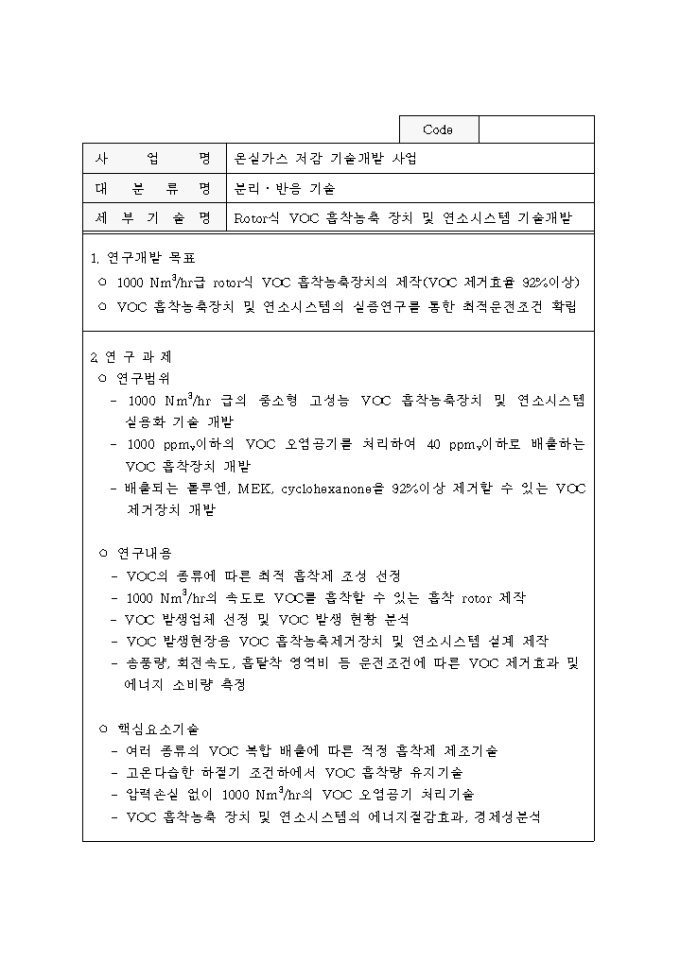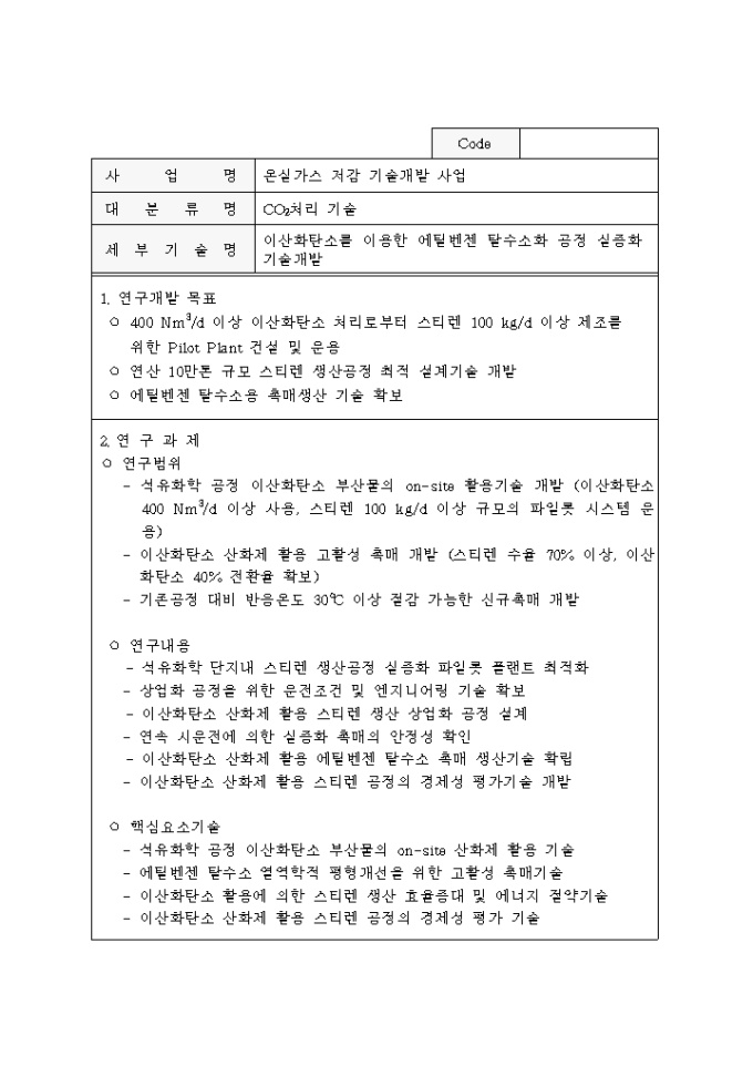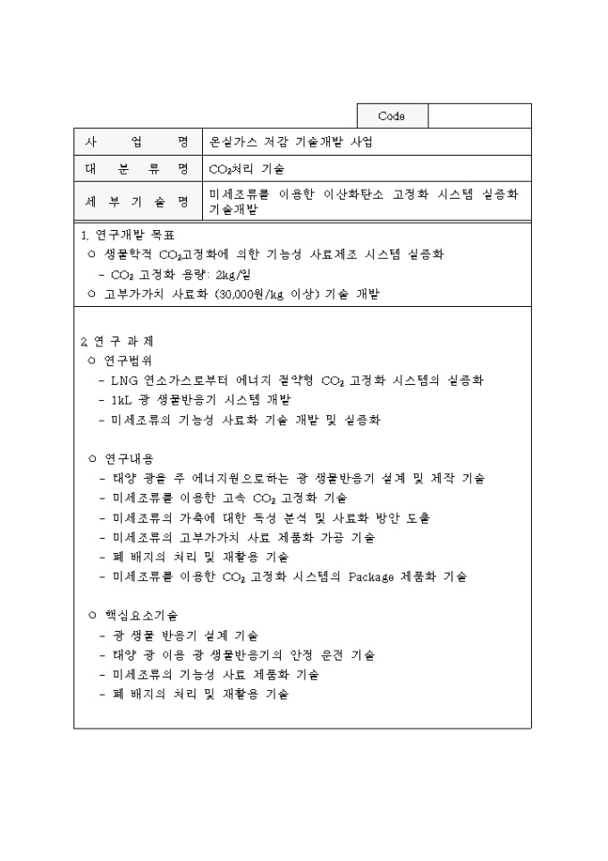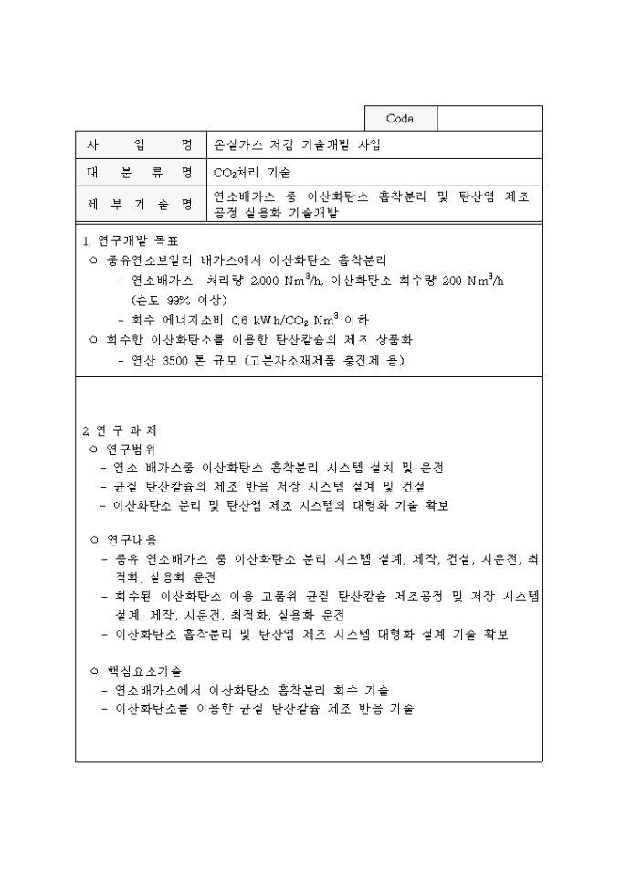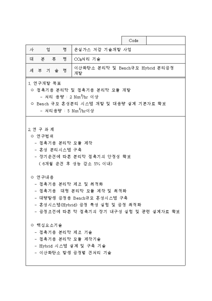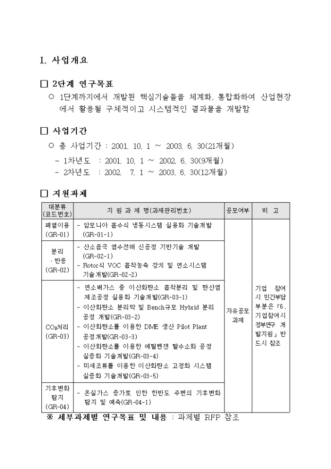 9,000원/월중점 온실가스 저감기술 개발사업 추진계획공고 양식입니다. 자세한 내용은 다음을 참고하세요. 1. 사업개요 2. 사업추진 방법 3. 연구과제 추진방법 4. 기업참여시 정부 연구개발비 지원 5. 기타 고려할 사항 6. 과제별 연구목표 및 내용 등의 내용으로 구성되어 있습니다.
