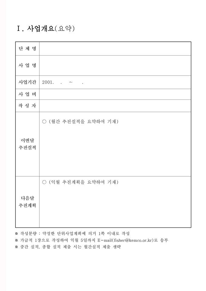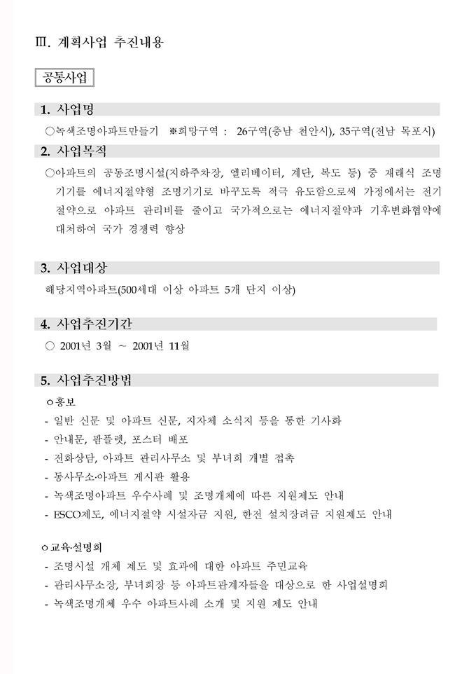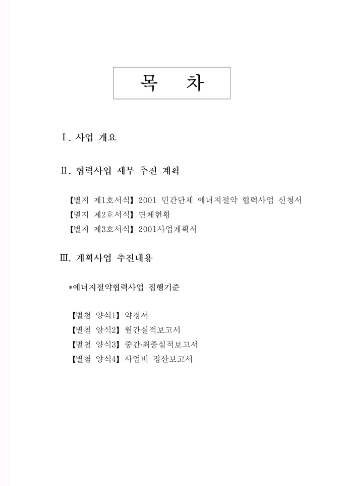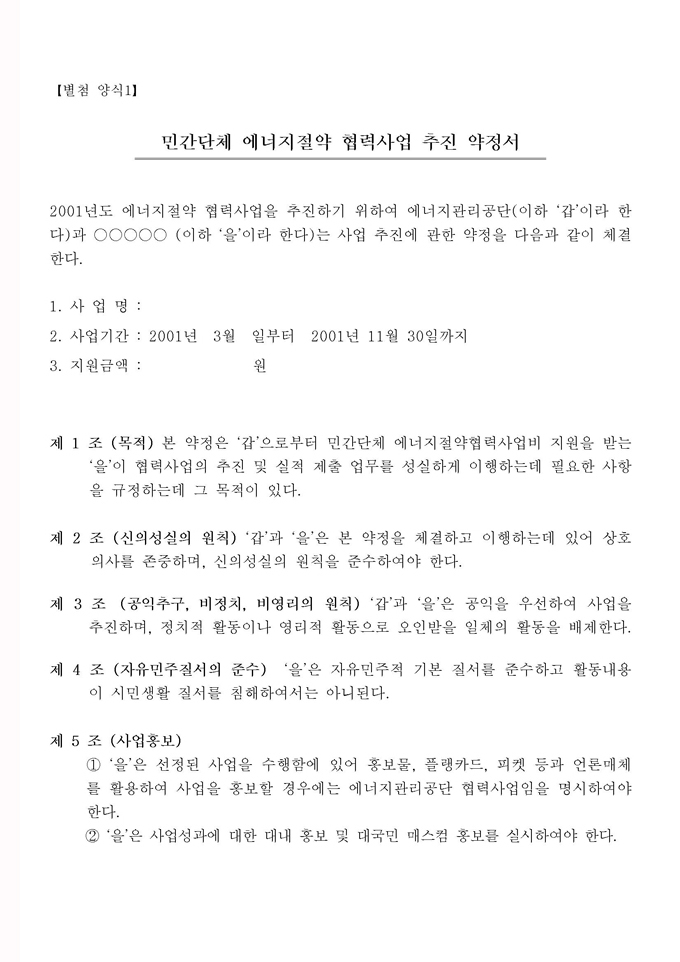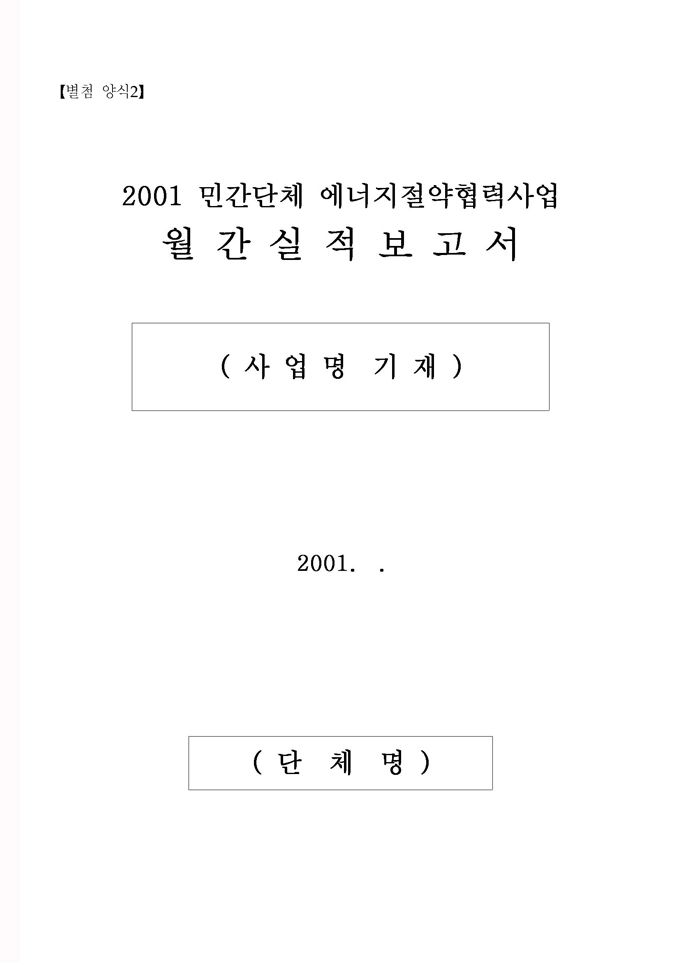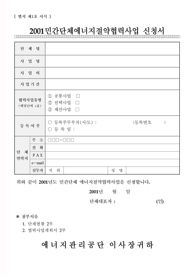 2001년 에너지절약협력사업 공모 양식입니다.계획사업내용, 공모안내총괄, 사업신청서, 실적과 정산보고양식, 약정서등으로 구성되어 있습니다.