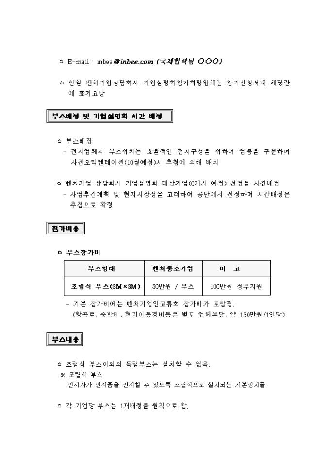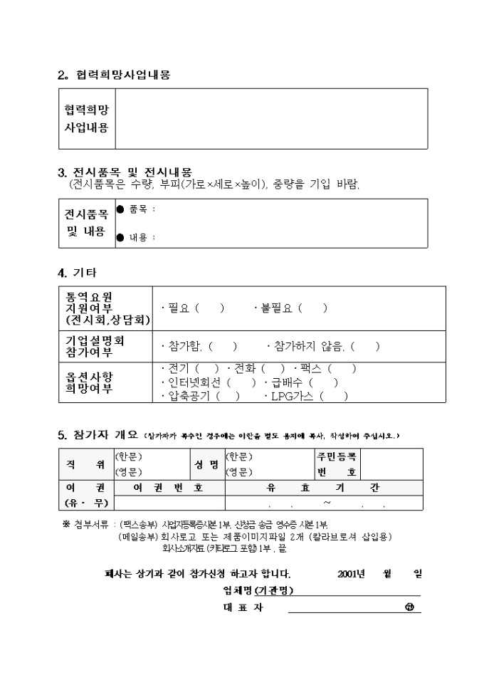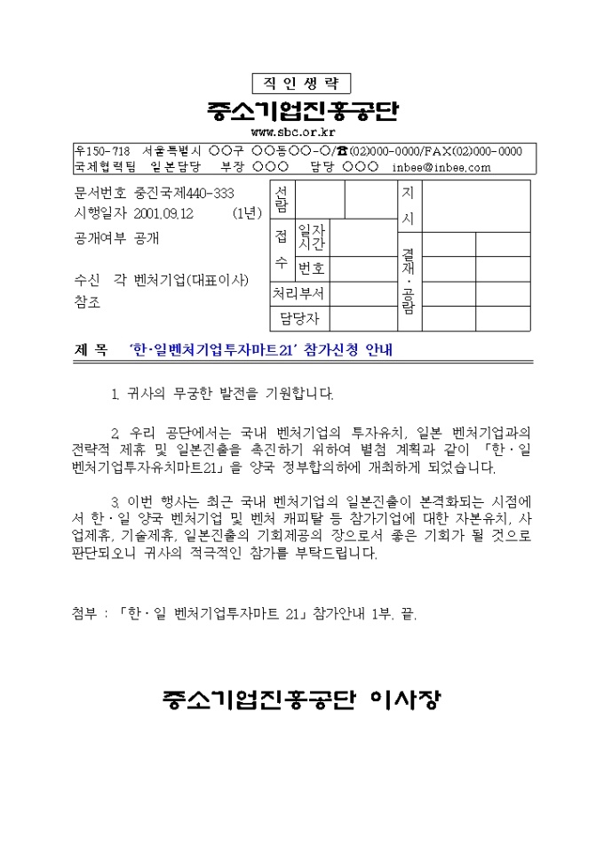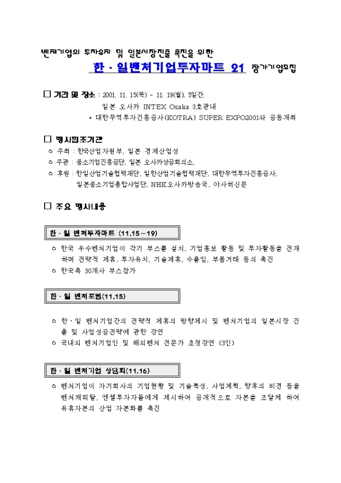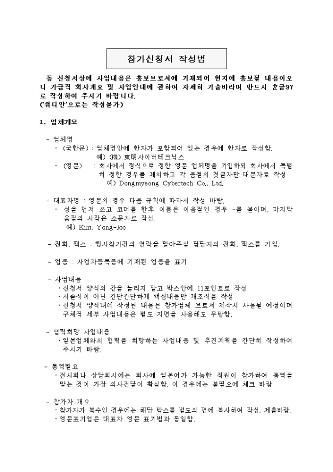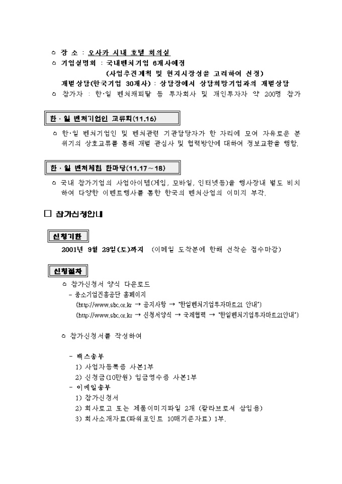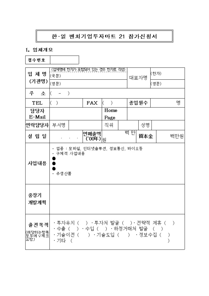 국제협력-한일벤처기업 투자마트21 신청서 양식입니다. 벤처기업의 투자유치 및 일본시장진출 촉진을 위한 한·일벤처기업투자마트 21 참가기업모집 안내와 한 일 벤처기업투자마트 21 참가신청서, 참가신청서 작성법등이 첨부되어 있습니다.
