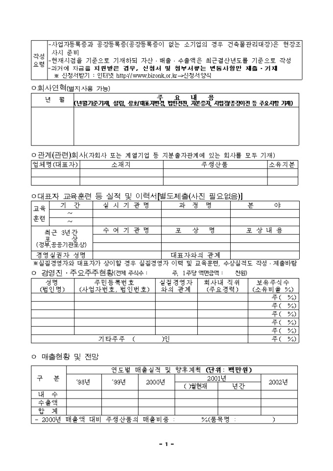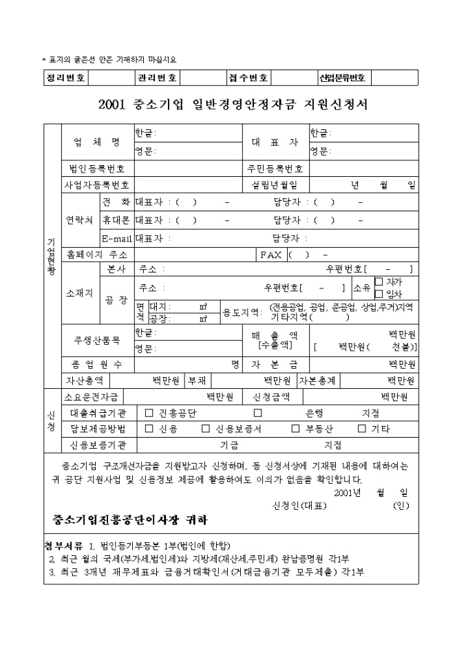 9,000원/월중소기업 구조개선자금을 지원받고자 할 때 제출하는 2001 중소기업 일반경영안정자금 지원신청서양식입니다. 간략한 사업계획서 양식이 첨부되어 있습니다.
