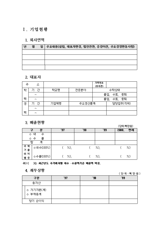 중소기업 남북경제협력 사업 추진에 따른 지원을 받고자 할 때 제출하는 중소기업 남북경협사업 타당성검토 의뢰서 양식입니다. 간략한 회사소개 양식이 첨부되어 있습니다.