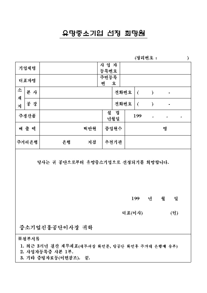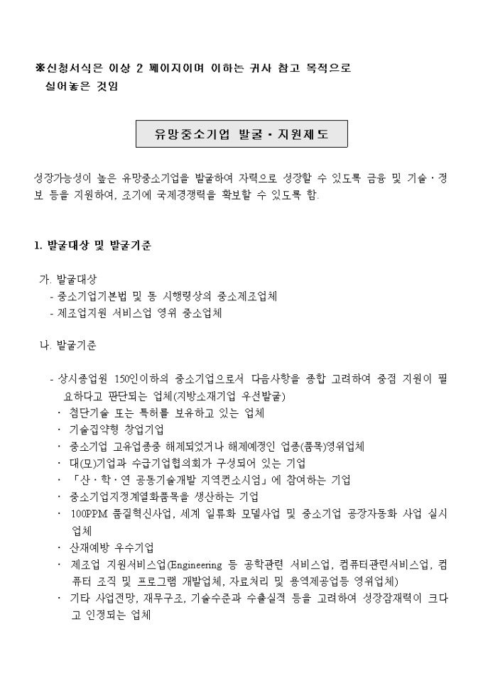 9,000원/월공단으로부터 유망중소기업으로 선정되기를 희망할 때 사용하는 양식입니다. 유망중소기업 발굴·지원제도에 대한 설명도 포함되어 있습니다.