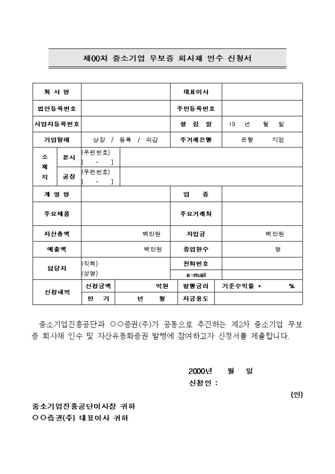 소기업진흥공단과 ○○증권(주)가 공동으로 추진하는 제2차 중소기업 무보증 회사채 인수 및 자산유동화증권 발행에 참여하긴 위한 제2차 중소기업 무보증 회사채 인수 신청서 양식입니다. 간략한 회사소개와 작성시 유의사항등의 설명이 기재되어 있습니다.
