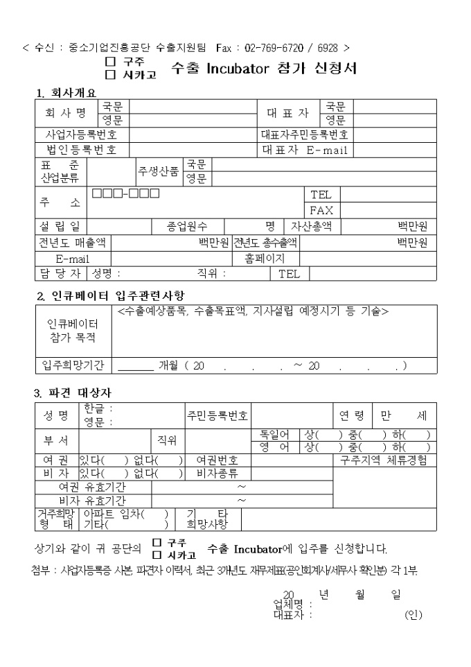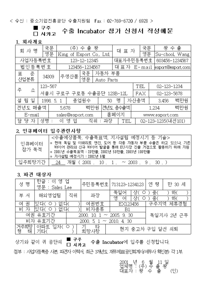 구주, 시카고 수출 인큐베이터 참가신청서양식과 그에 대한 예문 양식입니다.