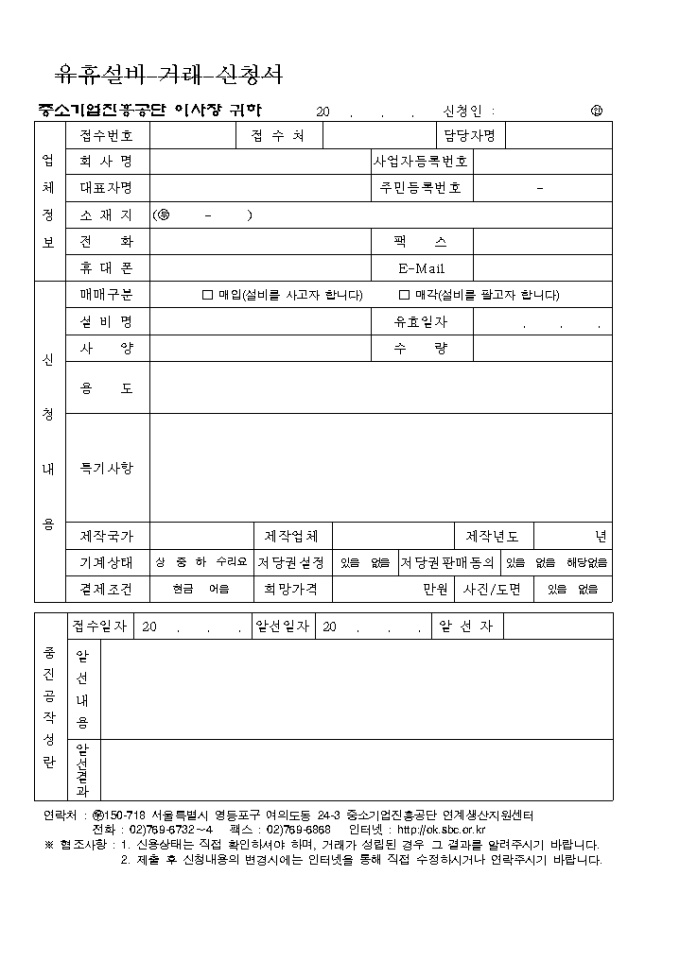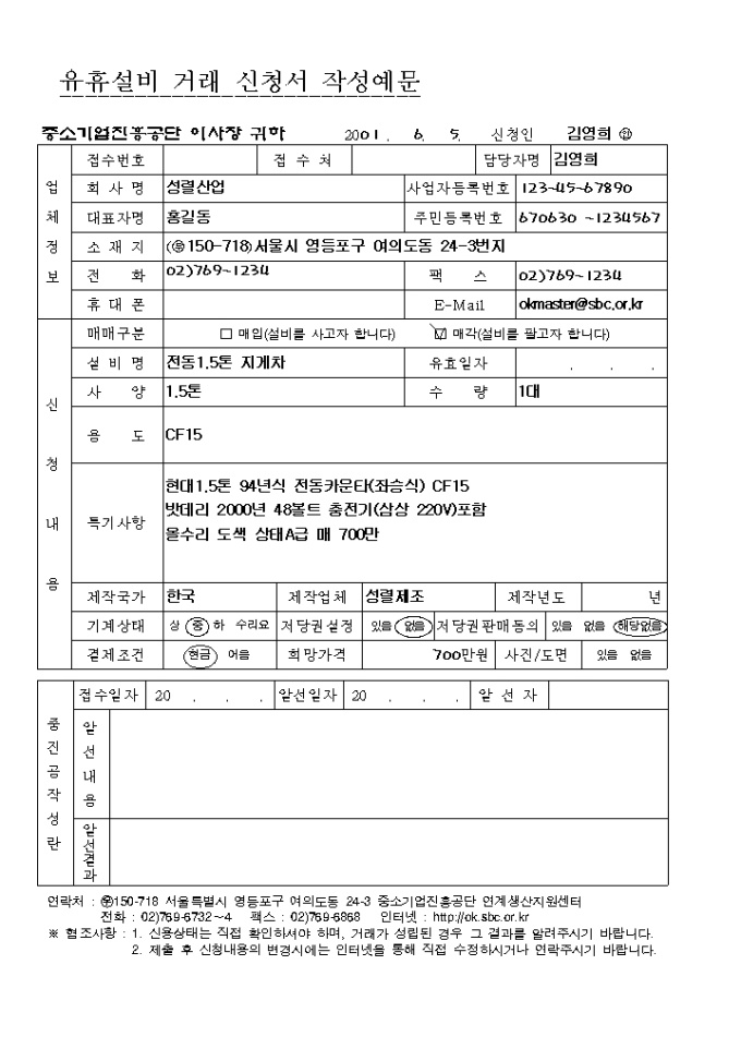 유휴설비거래신청서와 그에 대한 예문양식입니다. 업체정보, 신청내용, 중진공작성란등으로 구성되어 있습니다.