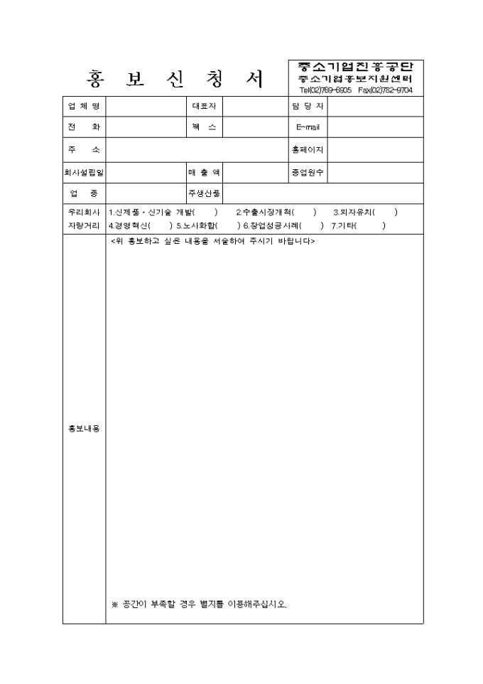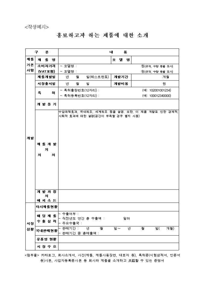 9,000원/월정보화 판로-홍보지원신청서 양식과 홍보하고자 하는 제품에 대한 소개가 예문형식으로 기재되어 있습니다.