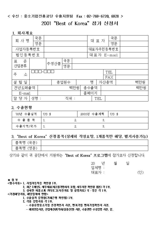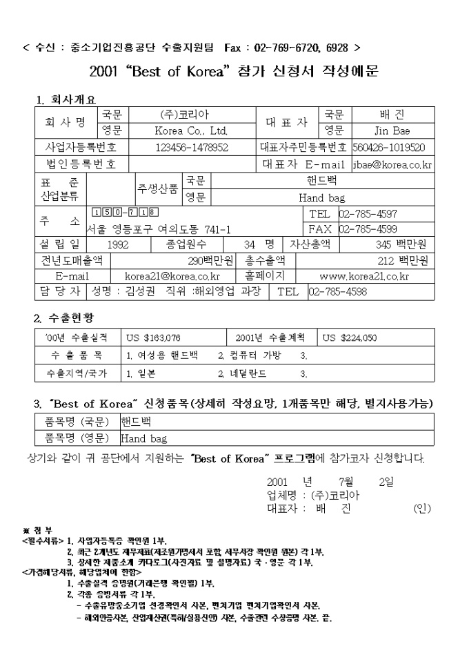 9,000원/월정보화 판로-Best of Korea 참가신청서과 그에 대한 예문입니다. 회사소개, 수출현황, "Best of Korea" 신청품목등으로 구성되어 있습니다.