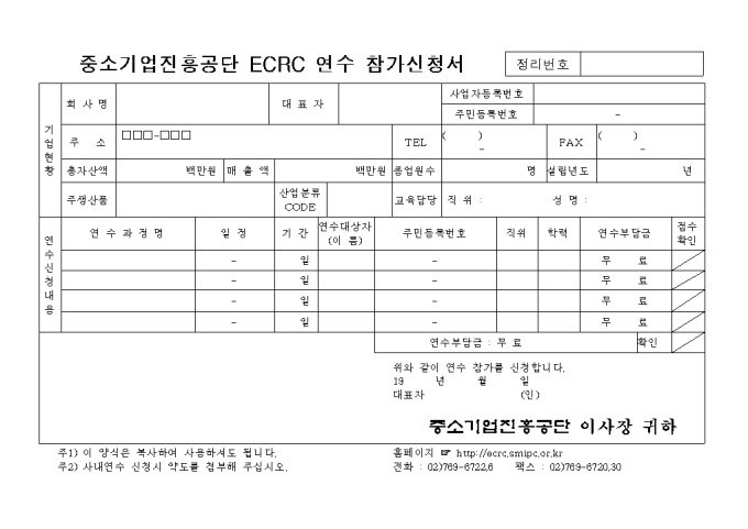 9,000원/월중소기업진흥공단 ECRC 연수 참가신청서양식입니다. 기업현황, 연수신청내용등의 내용을 기재하도록 되어 있습니다.