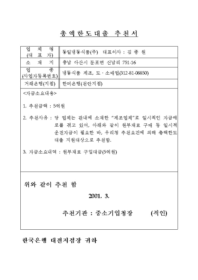 9,000원/월업체명, 소재지, 업종, 거래은행, 자금소요내용등으로 구성되어 있는 총액한도대출 추천서 양식입니다.