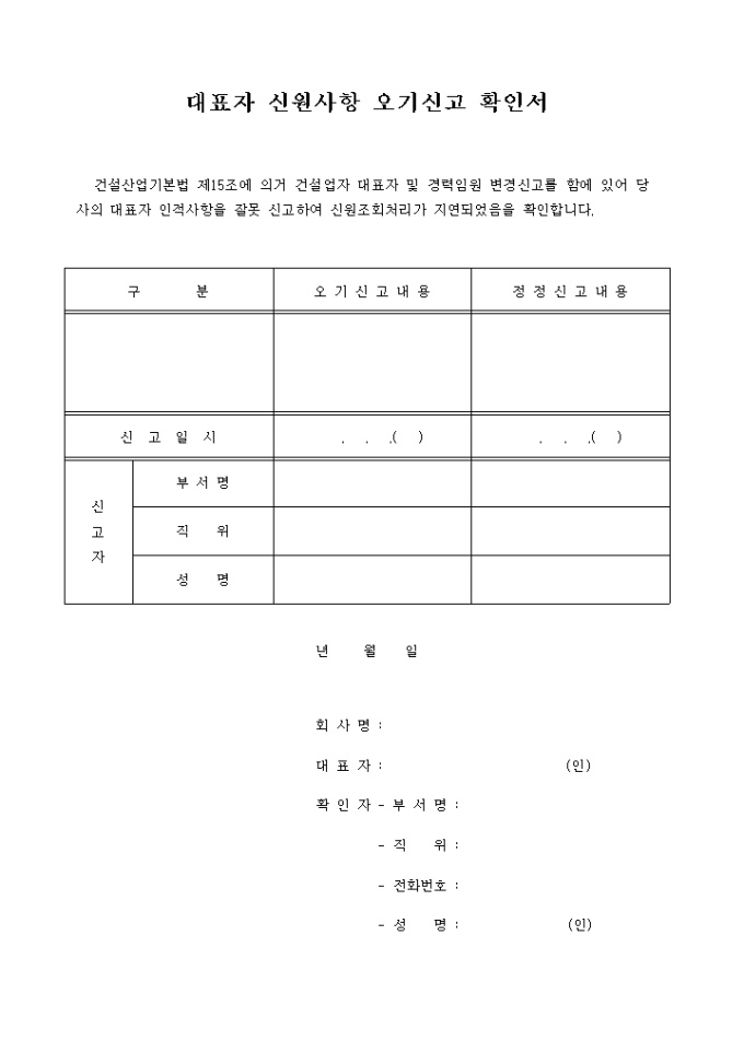 건설산업기본법 제15조에 의거 건설업자 대표자 및 경력임원 변경신고를 함에 있어 당사의 대표자 인적사항을 잘못 신고하여 신원조회처리가 지연되었음을 확인할 때 사용하는 양식입니다.