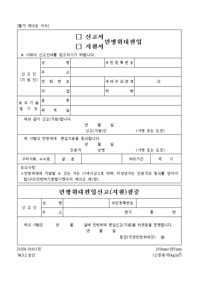 민방위대편입신고, 지원서