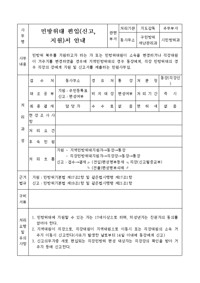 민방위대 편입신고, 지원서 양식입니다.