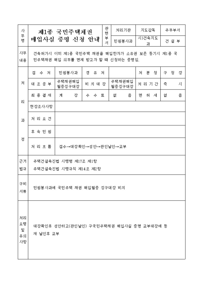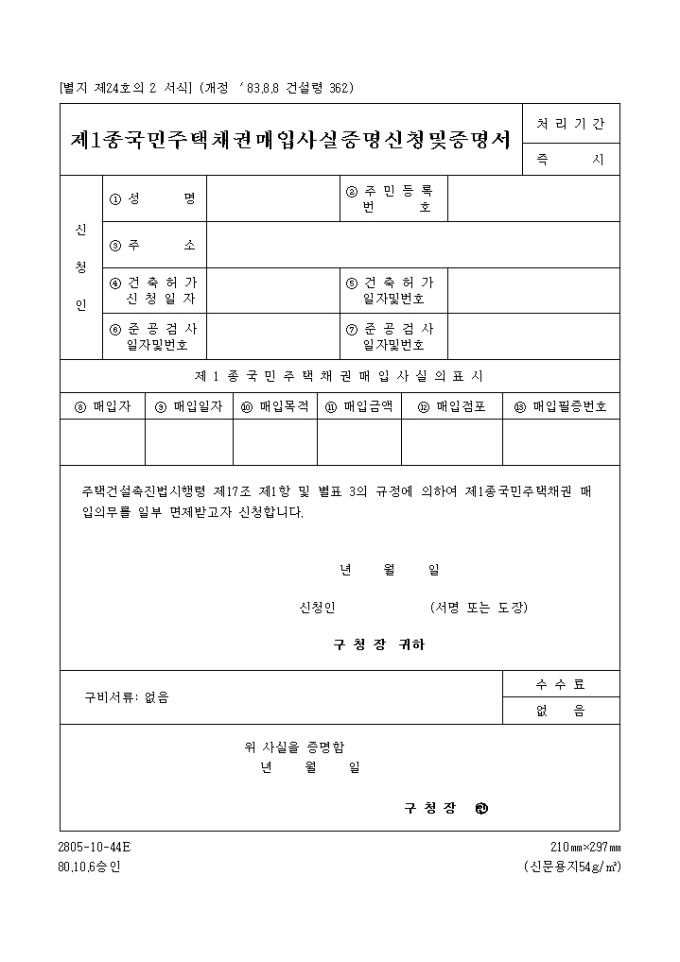 9,000원/월주택건설촉진법시행령 제17조 제1항 및 별표 3의 규정에 의하여 제1종국민주택채권 매입의무를 일부 면제받고자 신청할 때 사용하는 제1종 국민주택 채권매입 사실증명서 양식입니다.