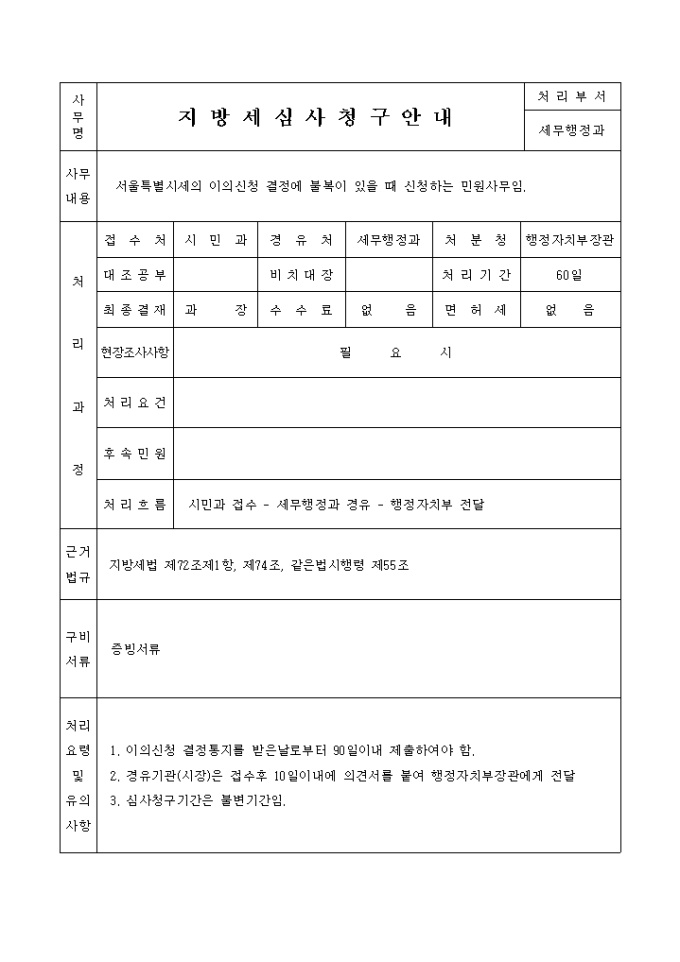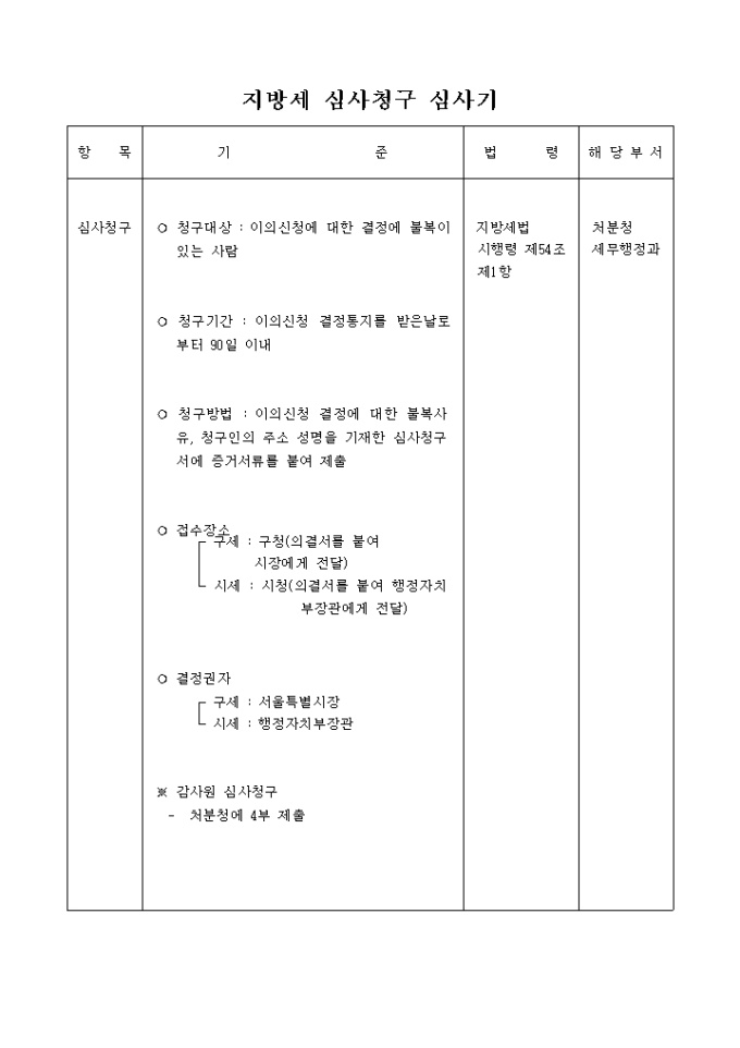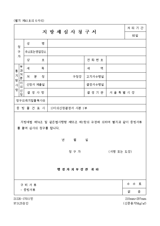 9,000원/월지방세법 제74조 및 같은법시행령 제55조 제1항의 규정에 의하여 별지과 같이 증빙서류를 붙여 심사의 청구를 할 때 사용하는 지방세 심사청구서(제41호의2) 양식입니다.