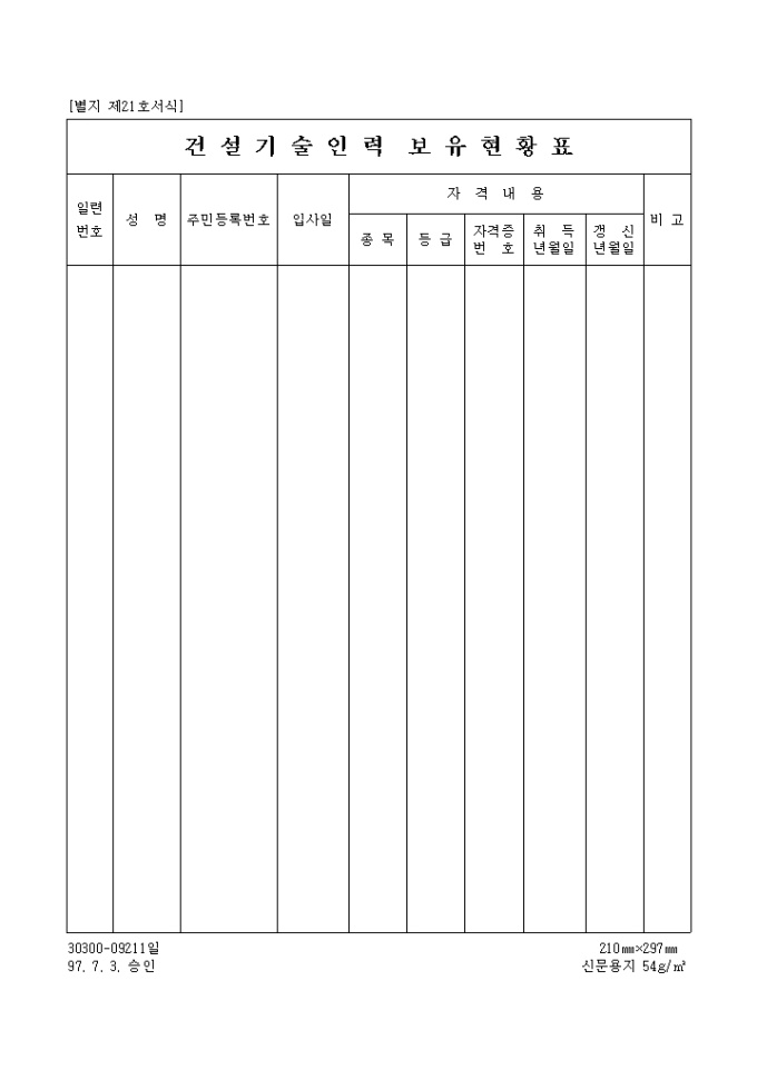 별지 제21호서식 건설산업기본법시행규칙에 의한 건설기술인력보유현황표 양식입니다. 종목, 등급, 자젹증번호, 취득년월일, 갱신년월일등으로 구성되어 있습니다.