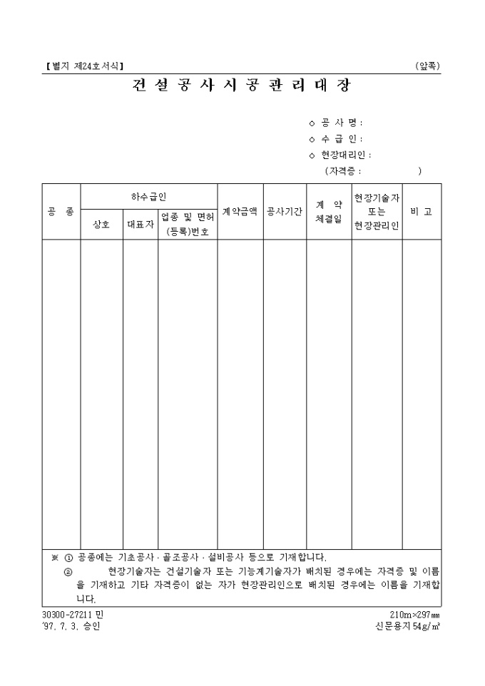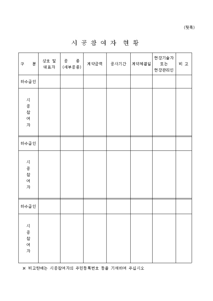 건설산업기본법시행규칙의한 건설공사시공관리대장,시공참여자현황 양식입니다.