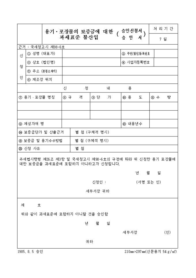 주세법시행령 제26조 제3항 및 국세청고시 제98-6호의 규정에 따라 위 신청한 용기 포장물에 대한 보증금을 과세표준에 포함하지 아니하고자 신청합니다.