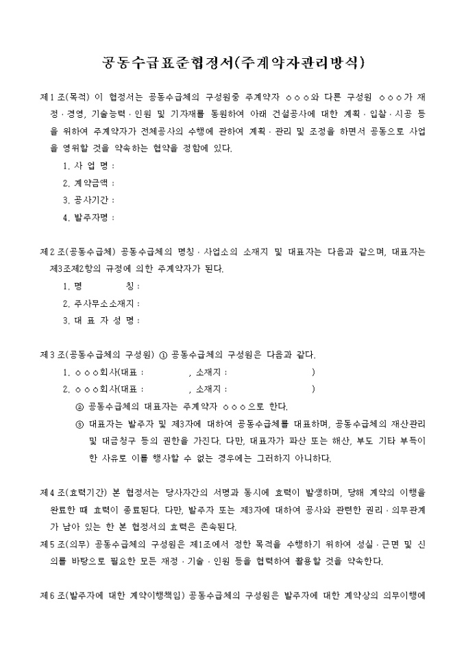 공동도급운영기준 협정서(주계약자관리방식)