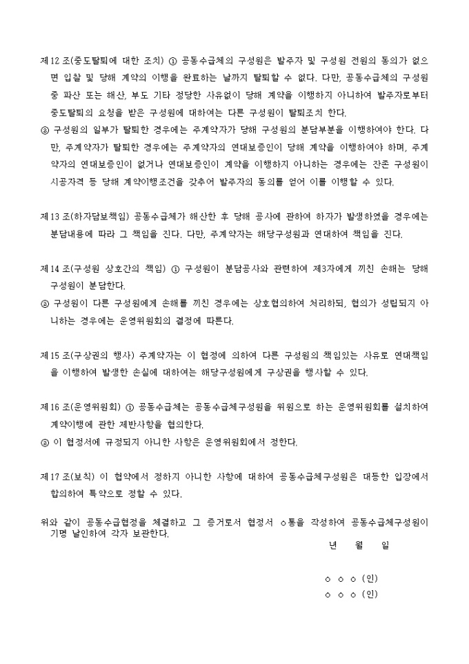 건설산업기본법시행령에 따른 공동도급운영기준 협정서(주계약자관리방식)양식입니다.모두 17개 조항으로 구성되어 있습니다.