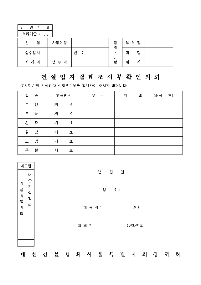 9,000원/월건설업자 실태조사부 확인 의뢰 양식입니다. 토건, 토목, 건축, 철강, 조경, 준설등 업종별로 면허번호, 부수, 제출처를 기록하게 되어 있습니다.