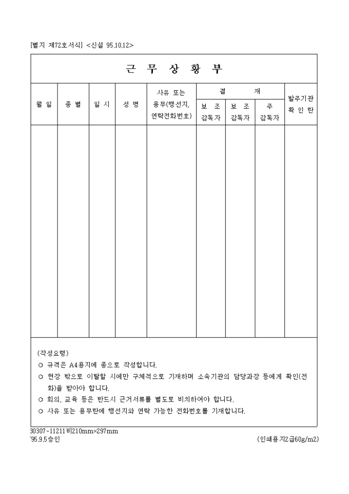 날짜, 종별, 일시, 성명, 사유 또는 용무, 결재등으로 구성된 근무상황부양식입니다.
