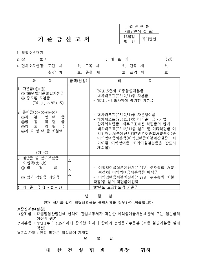 9,000원/월영업소소재지, 상호, 면허소지현황등으로 구성되어 있는 기준금 신고서양식입니다.