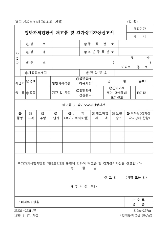 부가가치세법시행령 제63조의3의 규정에 의하여 재고품 및 감가상각자산을 신고합니다.