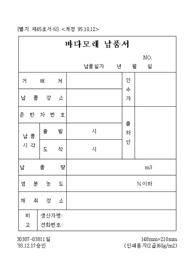 9,000원/월별지 제45호서식 거래처, 납품장소, 운반차번호, 납품시각, 납품량, 염분농도등으로 구성된 바다 모래 납품서 양식입니다.