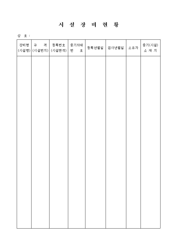 9,000원/월장비명, 규격, 등록번호, 중기차대 번호, 등록년월일, 검사년월일 소유자, 중기(시설)소재지등으로 구성되어 있는 시설장비 현황양식입니다.