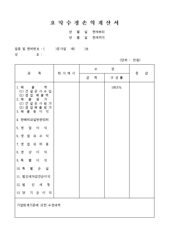 9,000원/월요약수정 손익계산서 양식입니다. 다음의 과목을 참고하세요.