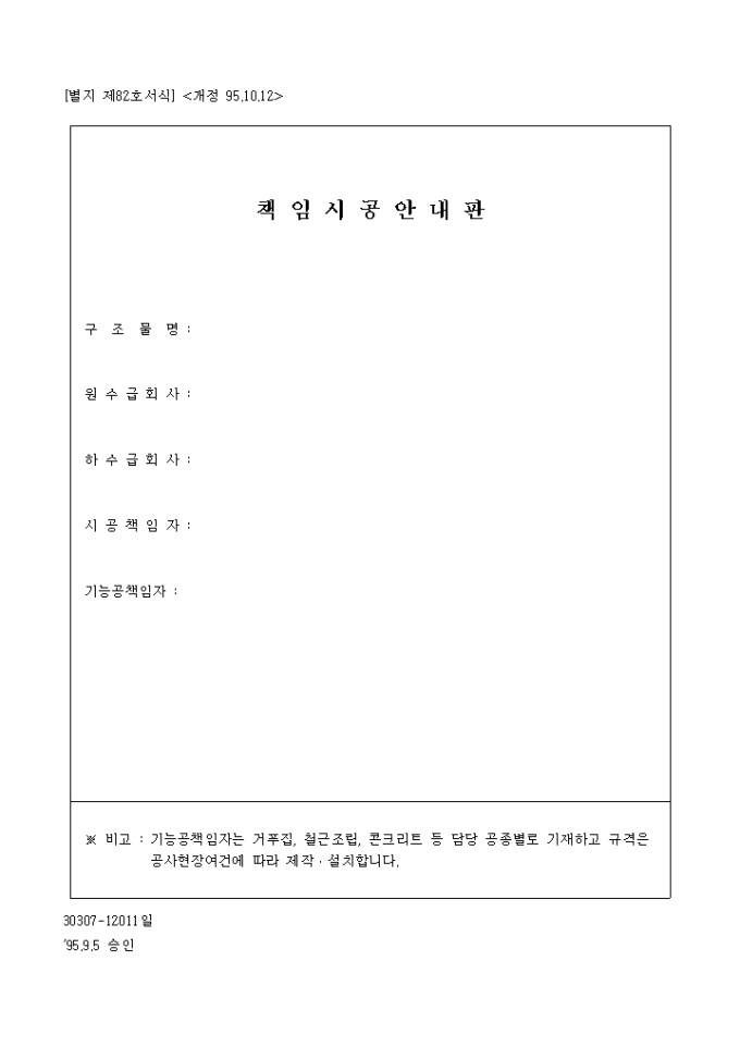 구조물명, 원수급회사, 하수급회사, 시고책임자등으로 구성되어 있는 책임 시공 안내판 양식입니다.