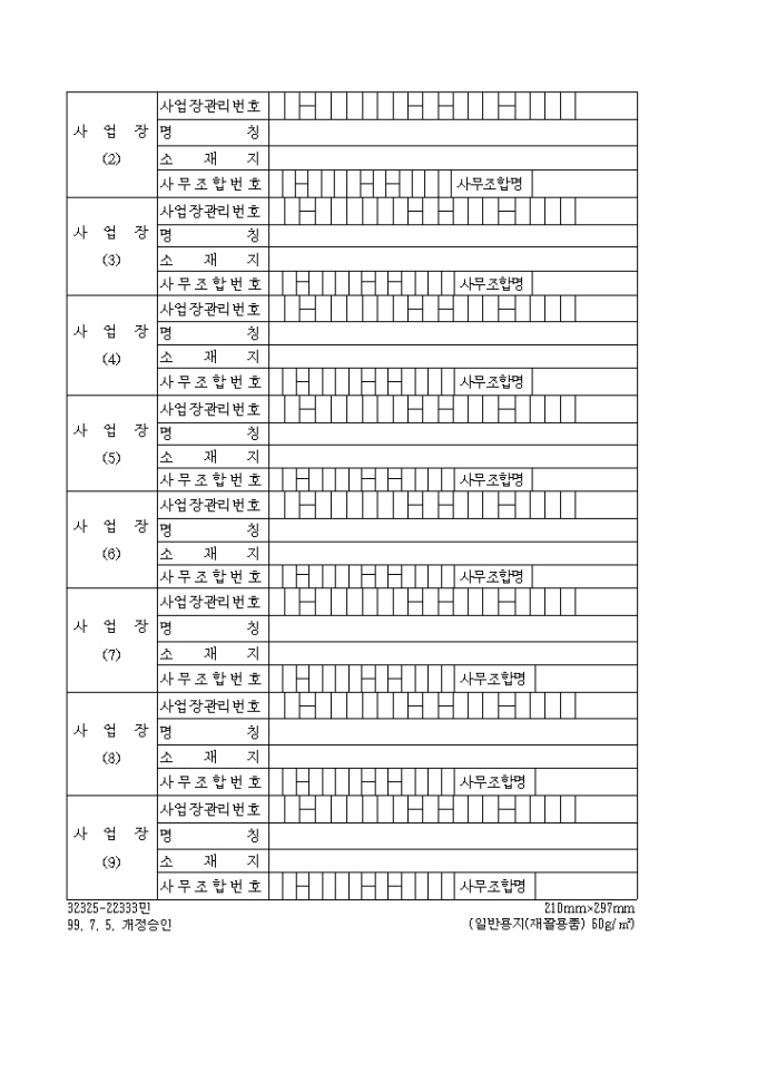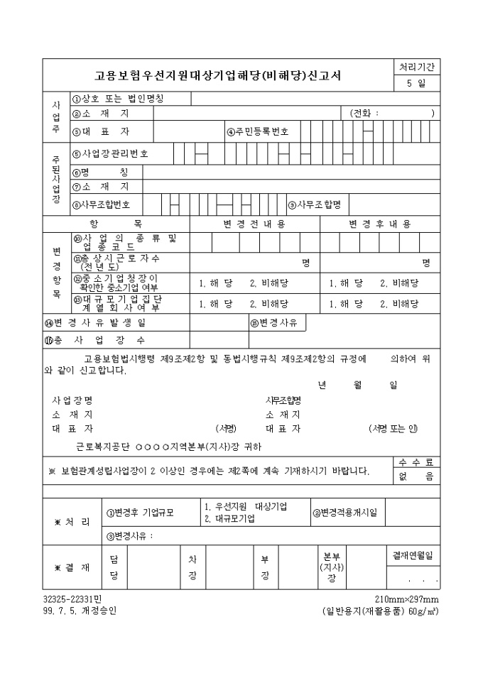 9,000원/월고용보험법시행령 제9조제2항 및 동법시행규칙 제9조제2항의 규정에 의하여 위와 같이 신고할 때 사용하는 "고용보험 우선지원 대상 기업해당(비해당)신고서" 양식입니다.