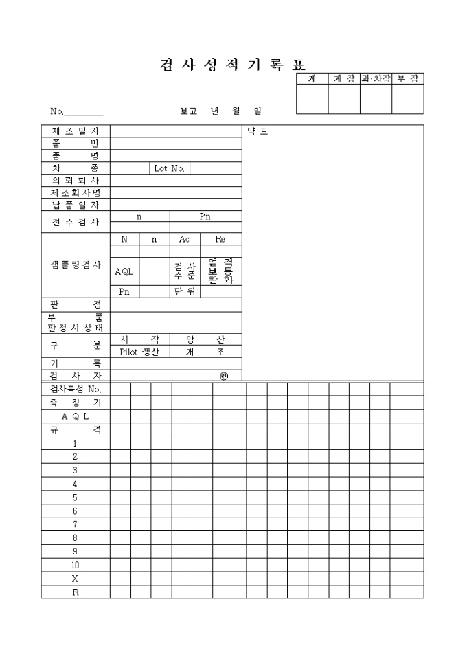 9,000원/월제품의 전수, 샘플링, 부품판정시상태 등을 검사한 성적을 기록한 표입니다.
