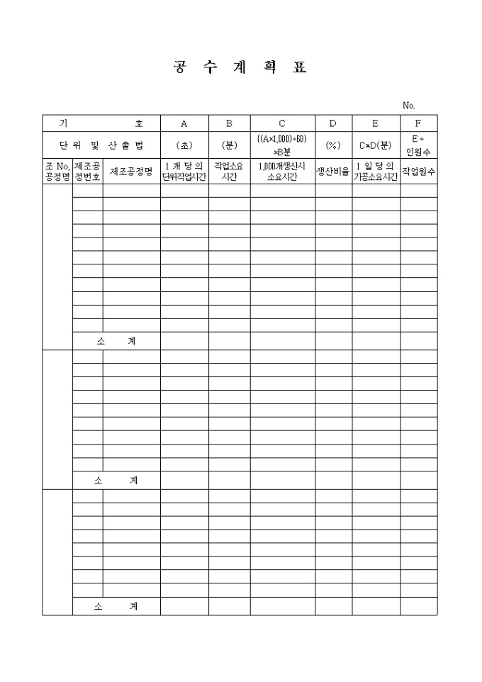 9,000원/월제조물 1개당의 단위작업시간,작업소요시간,1000개 생산시 소요시간,생산비율 등을 기록하는 양식입니다.
