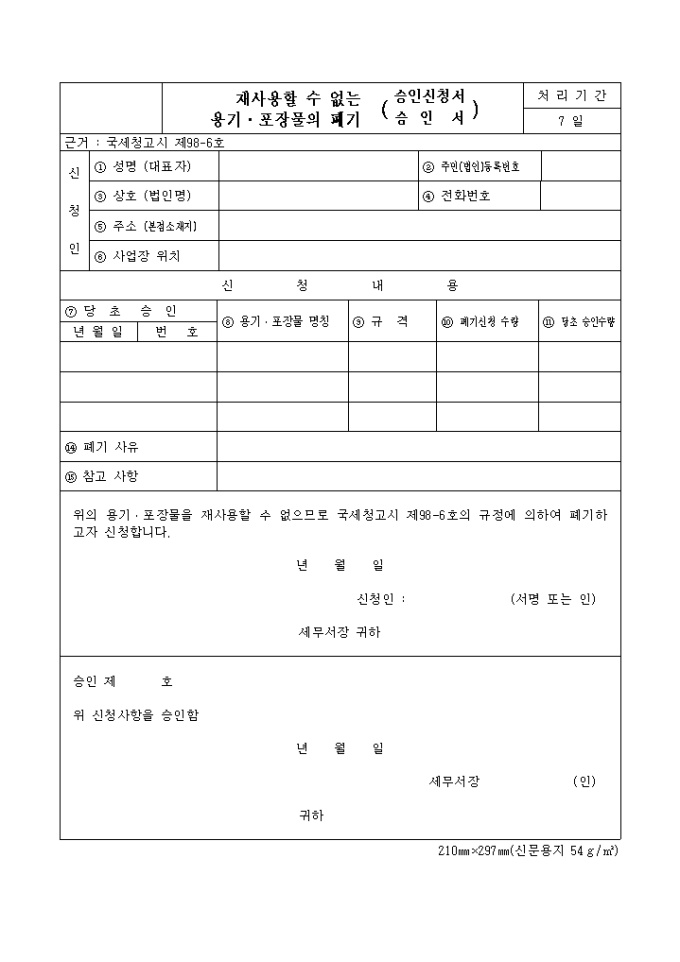 위의 용기․포장물을 재사용할 수 없으므로 국세청고시 제98-6호의 규정에 의하여 폐기하고자 신청합니다.