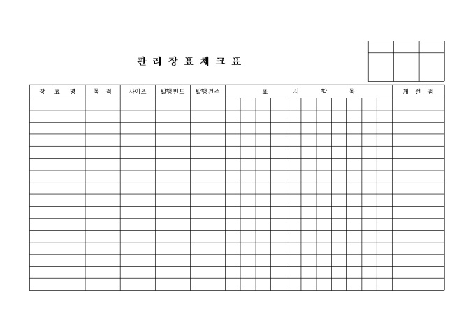 장표명, 목적, 사이즈, 발행빈도, 발행건수, 표시항목으로 구성된 관리장표체크표입니다.