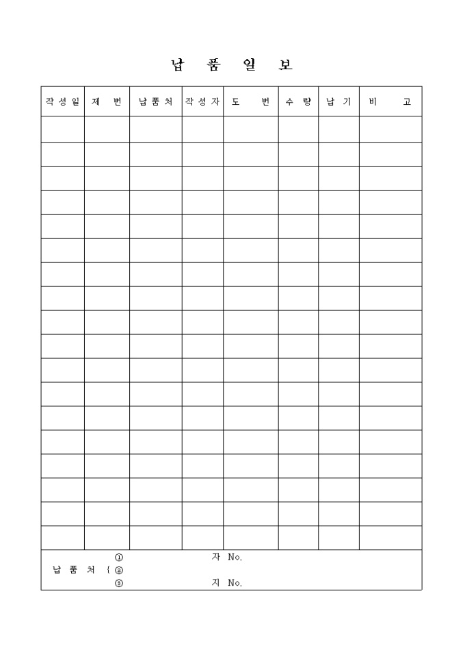 9,000원/월작성일, 제번, 납품처, 작성자, 도번, 수량, 납기로 구성된 납품일보 양식입니다.