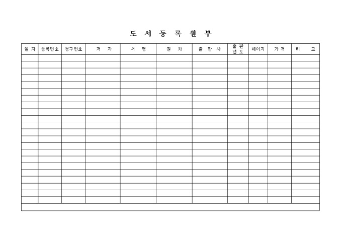 9,000원/월저자, 서명, 권차, 출판사, 출판년도, 페이지, 가격을 기재하는 도서등록원부 양식입니다.