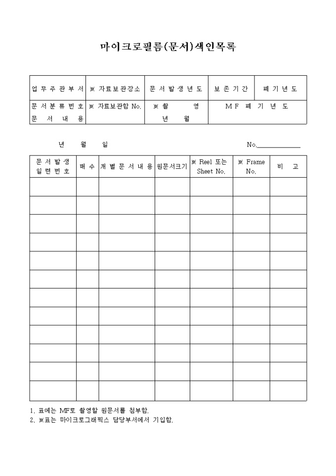 9,000원/월마이크로필름의 제작일자, 크기, 명칭, 기기번호 등을 기재하는 양식입니다.
