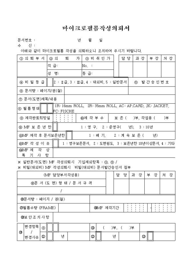 의뢰부서, 의뢰자, 비취인가, 비밀등급, 문서량 등으로 구성된 마이크로필름 작성의뢰서입니다.