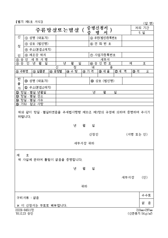 9,000원/월주류 망실 또는 멸실(증명신청서,증명서) 양식 예제입니다.