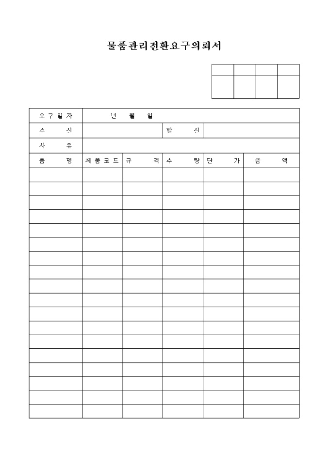9,000원/월요구일자, 수신, 발신, 사유, 관리전환 물품의 내역을 기재하는 양식입니다.