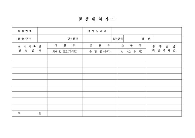 대분류, 중분류, 소분류별 물품이 있는 위치를 기록하는 양식입니다.