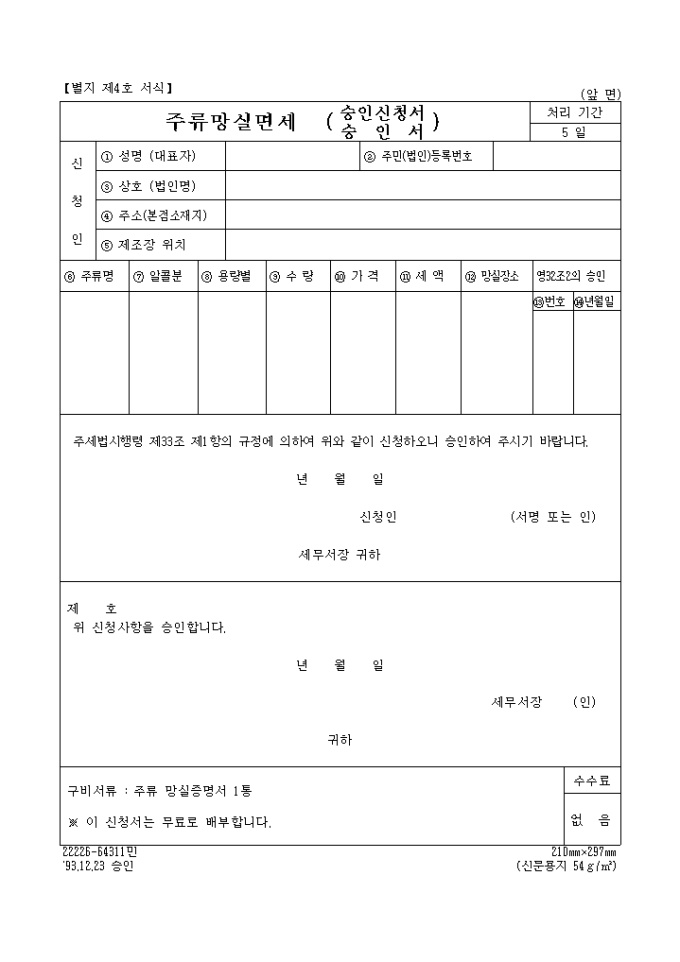 주류망실면세(승인신청서, 승인서)